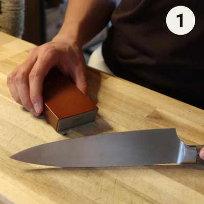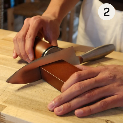 Fakta: Till skillnad från traditionella drag-igenom-slipar förfinar Hatoris diamantbelagda skivor eggen varsamt, utan överdriven slipning. Det bevarar och förlänger knivarnas livslängd.